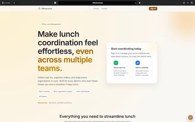 A lunch coordination app for busy admins. Collect opt-ins, organize orders, and keep multiple organizations in sync — so Friday lunch runs itself instead of eating up your week.